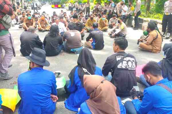 Tuntutan massa pendemo yang menggelar aksi unjuk rasa di ruas Jalan Lambung Mangkurat Banjarmasin di kawasan Gedung DPRD Provinsi Kalsel imbas dari kelangkaan minyak goreng dan penetapan kebijakan pemerintah terkait kebijakan harga jual yang menyesuaikan harga pasar.