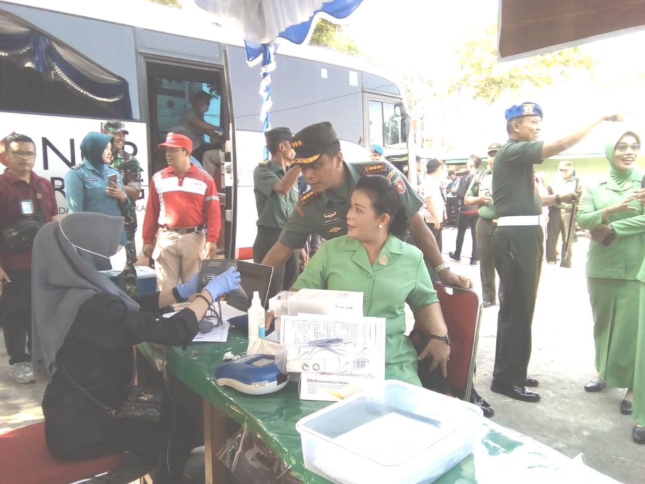 TENSI DARAH-Istri Dandim 1007/Banjarmasin Yusnia Revawati Anggara Situmpul saat memeriksa tensi darah kepada petugas kesehatan pada Bakti Sosial (Baksos) dan KB Kesehatan dalam rangka Pembinaan Terpadu (Binter) Terpadu Kodim 1007/ Bjm TA 2019, Sabtu (16/11/2019) pagi, di halaman Koramil Bjm Selatan. (foto:sum/brt)