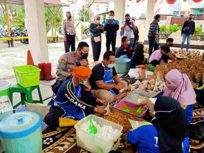 Sejak pagi sebanyak belasan anggota Tagana Provinsi Kalimantan Selatan (Kalsel) sudah menyiapkan sebanyak 750 nasi bungkus yang dibungkus dengan kertas. Dengan membuat nasi bungkus yang gizinya seimbang dari telur, tahu dan tempe serta susu.
