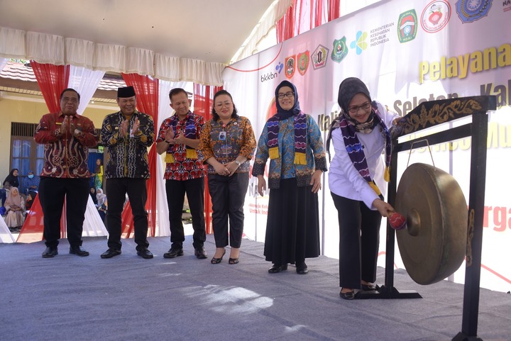 Pj. Bupati Mujiyat saksikan pembukaan kegiatan Pelayanan KB Perbatasan oleh Staf Ahli Bidang Kemasyarakatan Provinsi Kalsel Husnul Hatimah ditandai dengan pemukulan Gong,