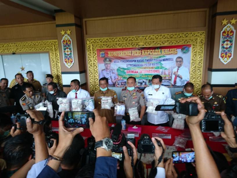 Banjarmasin, BARITO – Diringkusnya seorang tersangka jaringan Narkoba Malaysia dengan barang bukti puluhan kg Sabu dan ektasi, berinisial SAZA alias HBB (28) menurut Gubernur Kalsel H Sahbirin Noor pengedar narkotika seperti bara dalam sekam, Senin (20/1/2020) pagi. Usai Press Release Kapolda Kalsel Irjen Yazid Fanani itu, Paman Birin menyatakan temuan kepolisian itu sangat luar biasa, apalagi sudah melibatkan jaringan internasional Malaysia Sumatera Jawa Timur dan Kalimantan.