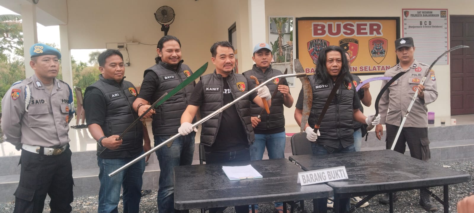 Kapolsek Banjarmasin Selatan Kompol Christugus Lirens melalui Kanit Reskrim AKP Joko Sulistiyo Sriyono dalam press release sore tadi mengatakan, belasan anak tersebut diamankan di kawasan Rantauan Timur I, Kelurahan Pekauman, Kecamatan Banjarmasin Selatan. Barang bukti yang diamankan antara lain satu bilah keris, beberapa parang, samurai, clurit pendek dan panjang, hingga clurit dengan gagang berbentuk tongkat.
