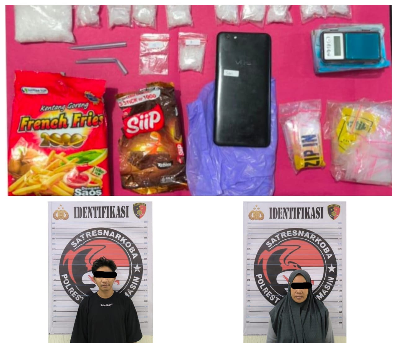 Dua pengedar Sabu-sabu warga Pekapuran Banjarmasin Timur, AMR dan CS ini digrebek di Hotel Bumi Banjar di Km 7,9 Kertak Hanyar Kabupaten Banjar, Sabtu (7/12/2024) malam. (foto:ist)