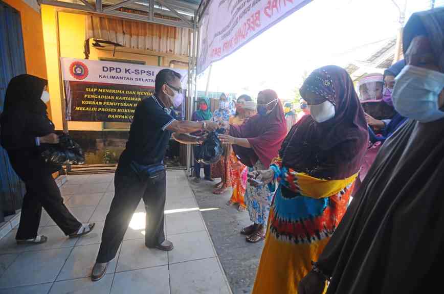 Sebanyak 1000 paket di bagikan kepada anggota dan warga sekitar kantor KSPSI di kawasan Jalan Mantuil Permai, Kecamatan Banjarmasin Selatan, Kota Banjarmasin, Minggu (2/5/2021).