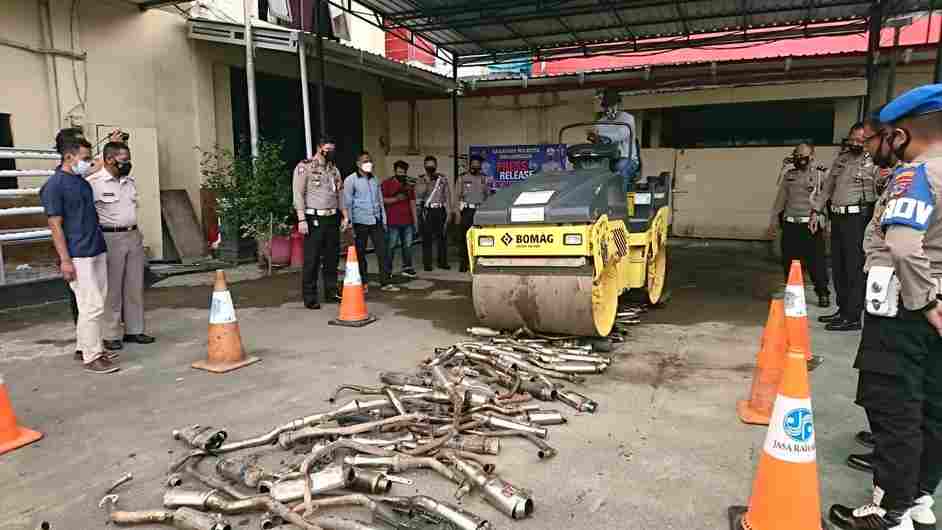 Banjarmasin, BARITO – Dengan menggunakan Stum atau mesin penggilas untuk jalanan, kali ini dipakai untuk menghancurkan sebanyak 110 Knalpot Brong hingga penyok dan pecah, Kamis (20/5/2021). Pemusnahan barang bukti ratusan knalpot itu merupakan hasil giat Operasi Ketupat Intan 2021 yang gelar selama selama 14 hari.