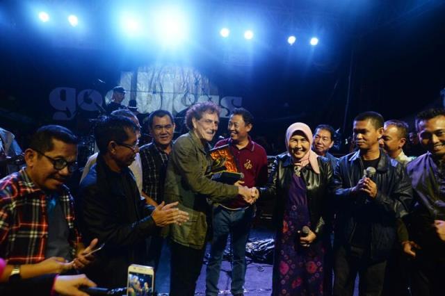 Achmad Albar usai nyanyi ” Rumah Kita” bersama Bupati dan Wakil Bupati Batola serta Forkompinda menyerahkan kenang kenangan cinderamata dari God Bless kepada Bupati Batola Hj Noormiliyani AS SH ( foto Rudy)