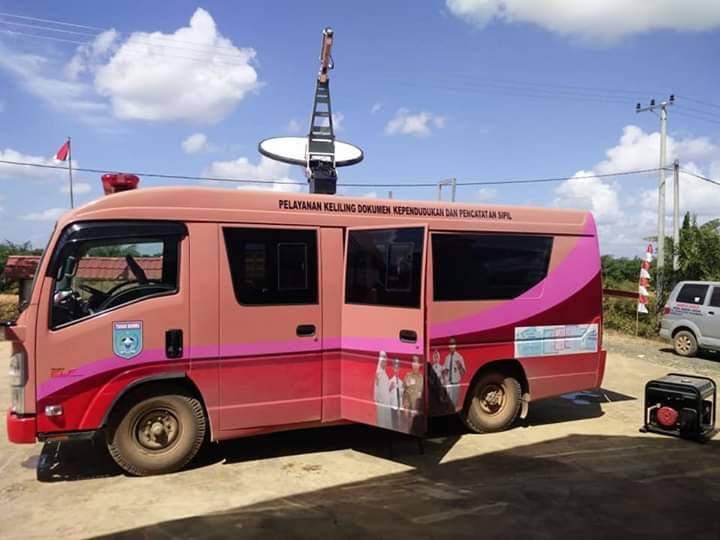 Pelayanan keliling tersebut menggunakan bus yang sudah dilengkapi dengan peralatan untuk pencetakan dan perekaman dokumen kependudukan.