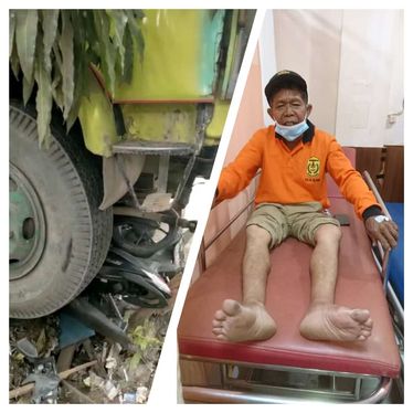 Kelurahan Pekapuran Banjarmasin Timur itu masih beruntung, kakinya sempat terjepit ban truk kontainer. Namun nyawa masih berpihak padanya, karena hanya bengkak saja pada kedua kakinya.