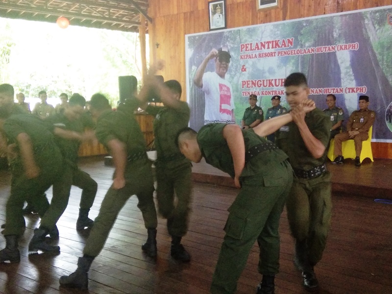 ATRAKSI-Para Polisi Hutan (Polhut) Dinas Kehutanan Provinsi Kalimantan Selatan melakukan atraksi bertarung di hadapan Gubernur Kalsel, Sahbirin Noor, usai pelantikan Kepala Resort Pengelola Hutan (HRPH) dan tenaga kontrak pengamanan hutan (TKPH), Senin (31/12) di Desa Kiram Kabupaten Banjar. (foto slm/brt)