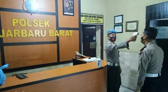 Polsek Beruntung Baru yang merupakan jajaran Polres Banjarbaru Kanit Provost Polsek Barat Aiptu Rahmadi Jaya melaksanakan cek suhu dan masker kepada Kanit Lantas Iptu H. Hasmi dan personel lain selalu mengingatkan untuk selalu mematuhi Protokol Kesehatan Covid-19, Kamis (01/10/2020).