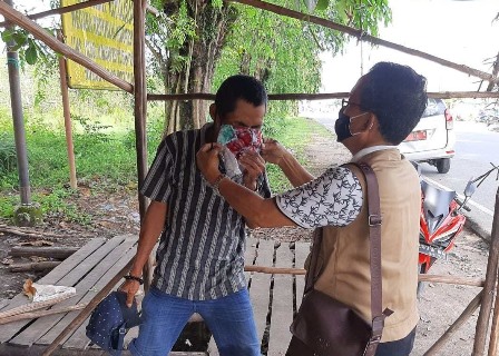 Dalam rangka mencegah penyebaran Covid-19, Polsek Banjarbaru Barat jajaran Polres Banjarbaru Bhabinkamtibmas Aiptu Eko Ristimurwanto memberikan teguan lisan dan memakaikan masker kepada warganya yang sedang berjualan di Kelurahan Landasan Ulin Tengah Kecamatan Liang Anggang Kota Banjarbaru. Jum’at (02/10/2020) sekitar pukul 10.00 Wita.