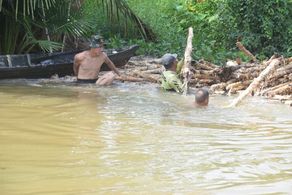 Material yang diangkut menggunakan perahu itu berupa kayu galam secara perlahan dari perahu tersebut digeser oleh anggota Satgas TMMD dan mereka harus terjun ke sungai hingga sampai di lokasi pengerjaan fisik.