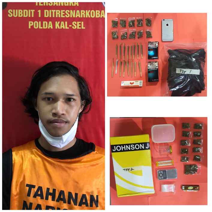 Direktur Ditresnarkoba Polda Kalsel Kombes Pol Iwan Eka Putra melalui Kasubdit1 AKBP Matsari HS kepada Barito Post, Rabu (30/12/2020) mengatakan penangkapan tersangka menyusul informasi yang didapat adanya rencana beredar nya ganja yang akan dikonsumsi pada malam pergantian tahun 2021. Dipimpin Kasubdit 1 AKBP Matsari HS, anggota Subdit1 atas perintah Direktur bergerak cepat dan berhasil mengetahui identitas tersangka. Segera saja anggota memancing tersangka dengan berpura pura jadi pembeli dan memesan 10 paket ganja berat 14,10 gram (bersih 11,42 gram). Tersangka yang tak mengira pemesan barang haram nya itu seorang polisi hanya bisa pasrah. Setelah dilakukan penggeledahan anggota Subdit1 kemudian berhasil menemukan