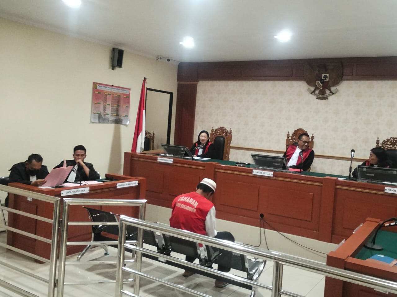 Sidang berlangsung tegang. Di hadapan Ketua Majelis Hakim Cahyono Reza Adrianto SH MH, terdakwa tampak lebih banyak menunduk sepanjang pembacaan tuntutan. Ibunda dan saudara terdakwa yang hadir di ruang sidang terlihat cemas mengikuti uraian jaksa.