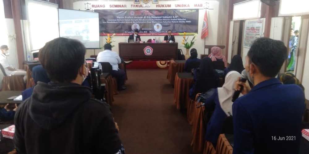 Seminar Hukum dalam rangka pelaksanaan pendidikan khusus profesi Advokat dan pendidikan profesi hukum berkelanjutan bagi mahasiswa FH Uniska itu mengangkat tema “Peran Profesi Hukum di Era Revolusi Industri 4.0” dihelat dengan dua sistem, yakni dengan tatap muka dan dalam jaringan (daring). Mengingat masih dalam situasi pandemi covid-19.
