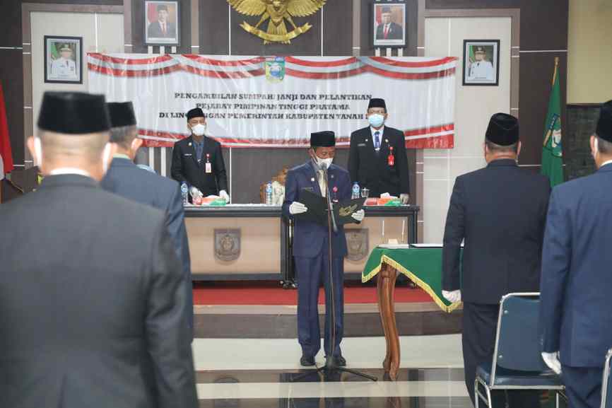 Pelaihari,BARITO – Gerbong pemerintahan dibawah pimpinan Bupati Tala H.M.Sukamta dan Wakil Bupati Abdi Rahman kembali mengalami pergeseran pejabat Pimpinan Tinggi Pratama atau biasa disebut kepala dinas. Senin, (30/8/21) digedung Sarantang Saruntung Pelaihari, Bupati Tala H.M.Sukamta melakukan pelantikan dan sumpah jabatan mutasi sejunmlah kepala dinas. Proses pelantikan ini tetap mengedepankan Protkes Covid 19.