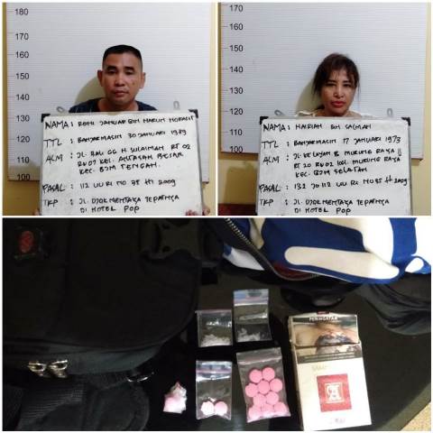 Dua muda-mudi bernama A Roni Januar (22) dan Hairiah (46) ini kedapatan saat menyimpan belasan diduga narkoba, Minggu (1/9/2019 sekitar pukul 22.47 Wita. Mereka diringkis di Parkiran Hotel Pop, Jalan H Djok Mentaya Kelurahan Kertak Baru Ilir Kecamatan Banjarmasin Tengah.