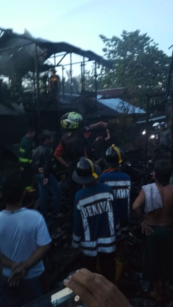 Melihat api berkobar warga belasan Pemadam Kebakaran (PMK) langsung menuju lokasi kebakaran yang juga sedikit merembet Mushala Nida’ul Khair. Dua bangunan besar yang terbuat dari kayu luluh lantak hingga menyisakan puing di dalam gang tersebut.