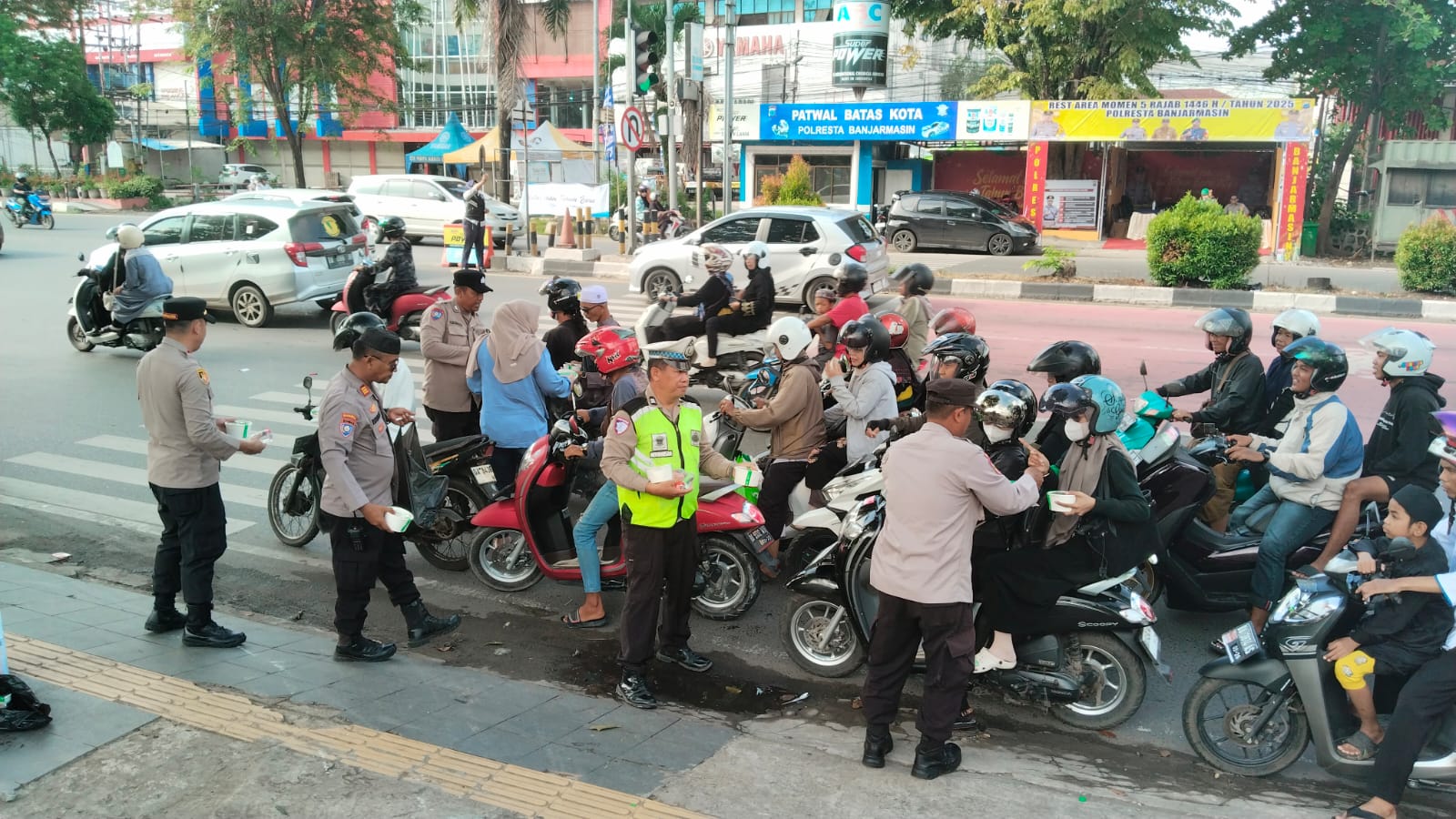 Selain menyediakan makanan dan minuman gratis, Polresta Banjarmasin juga menempatkan personel gabungan di jalur yang dilintasi jemaah untuk memastikan arus lalu lintas tetap lancar dan aman.