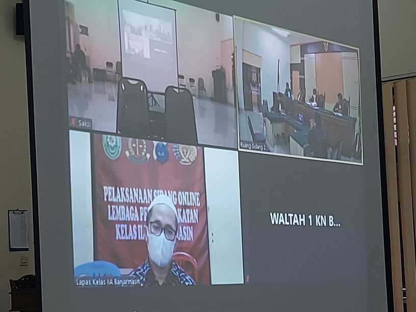 Mengenakan peci putih, terdakwa yang ditahan di Lapas Kelas IIA Banjarmasin mengikuti sidang secara virtual dan terhubung melalui aplikasi Zoom Meeting ke ruangan sidang.