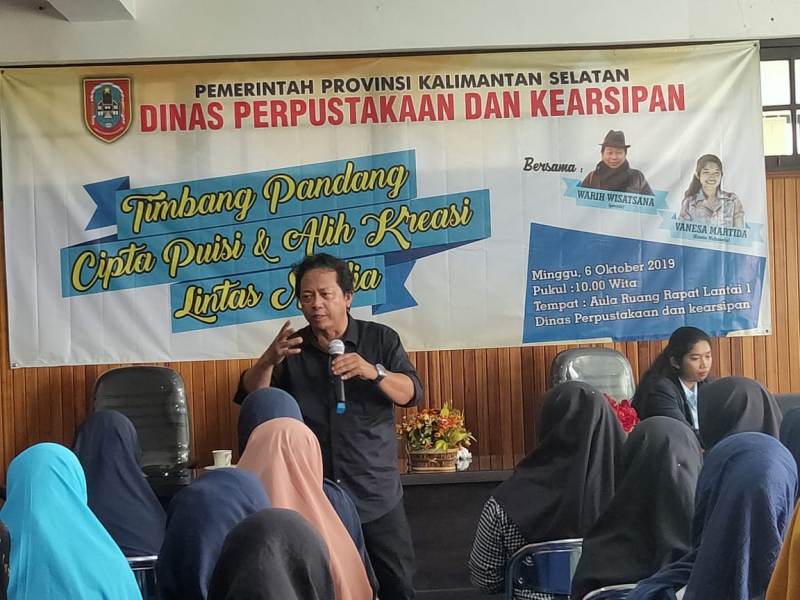 Demikian salah satu bahasan dalam diskusi bertajuk ‘Cipta Puisi & Alih Kreasi Lintas Media’ di aula Dinas Perpustakaan dan Arsip (Dispersip) Kalsel, Minggu (6/10), yang menghadirkan