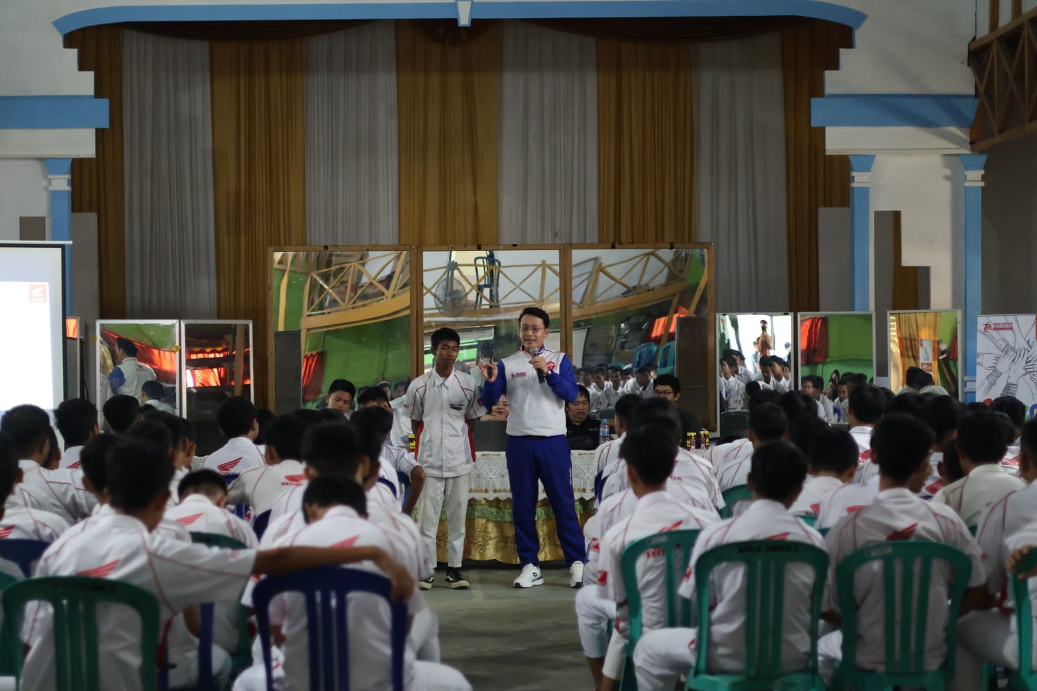 Aktivitas Safety Riding – Fomo mengajak para peserta untuk mengetahui dan belajar keselamatan berkendara dengan materi ajar “Danger Prediction” yang langsung diedukasi PIC Safety Riding Trio Moto, Yoga Prabowo di sekolah binaan Honda, yakni SMKN 2 Amuntai.