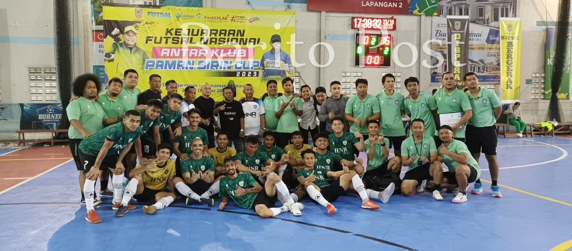 Tim Fafage Tapin (Kalimantan Selatan) usai mengalahkan La Masia Kotabaru 16-0 dipertandingan penyisihan grup pada Festival Kejuaraan Nasional (Kejurnas) Futsal Antar Klub Piala Paman Birin, Senin (23/10/2023) di Borneo Futsal Banjarmasin. (foto: Tolah/brt)