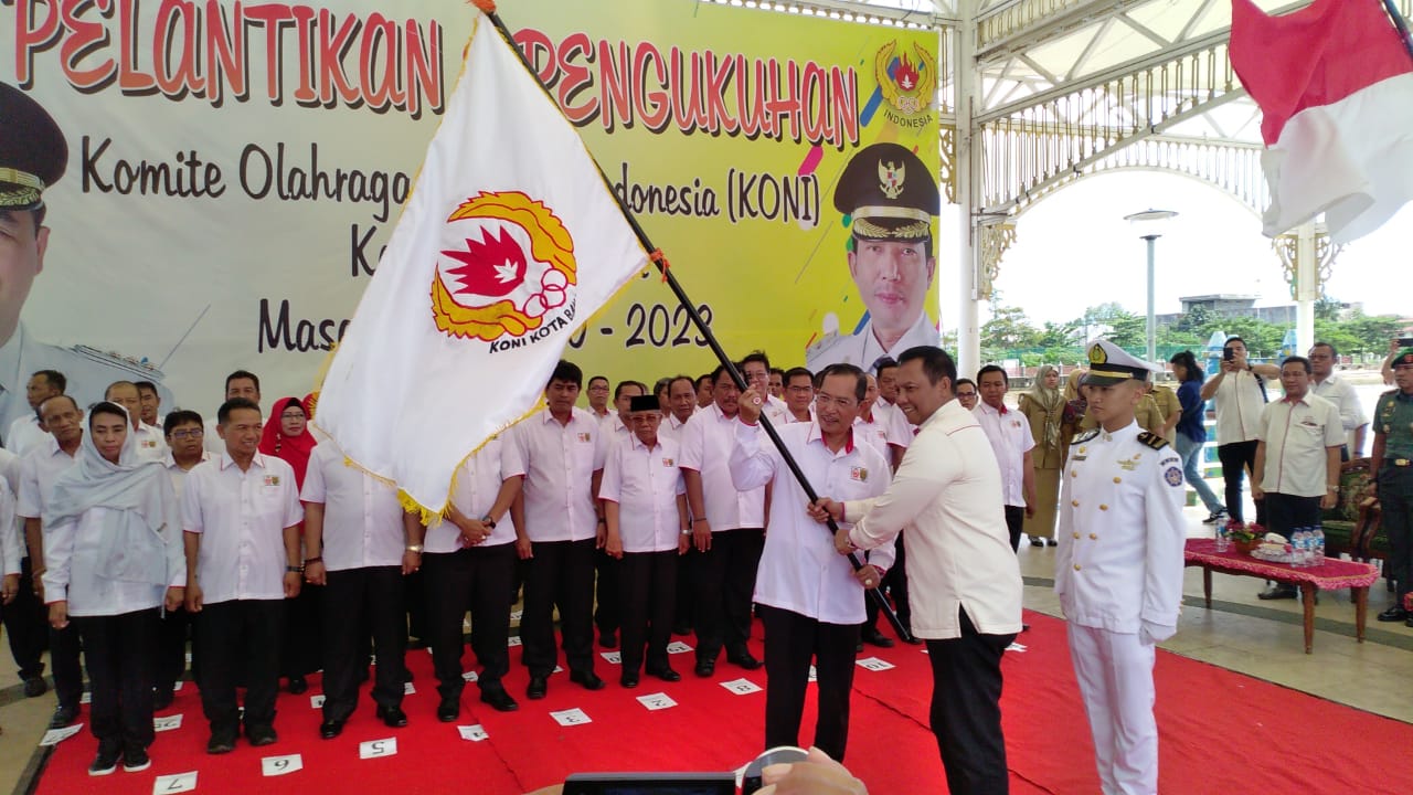 Banjarmasin, BARITO – Hermansyah, Ketua Komite Olahraga Nasional Indonesia (KONI) Kota Banjarmasin yang terpilih secara aklamasi akhirnya resmi dilantik dan dikukuhkan bersama seluruh jajarannya oleh Ketua KONI Provinsi Kalsel Bambang Heri Purnama, di siring depan Balai Kota Banjarmasin, Senin (4/3).