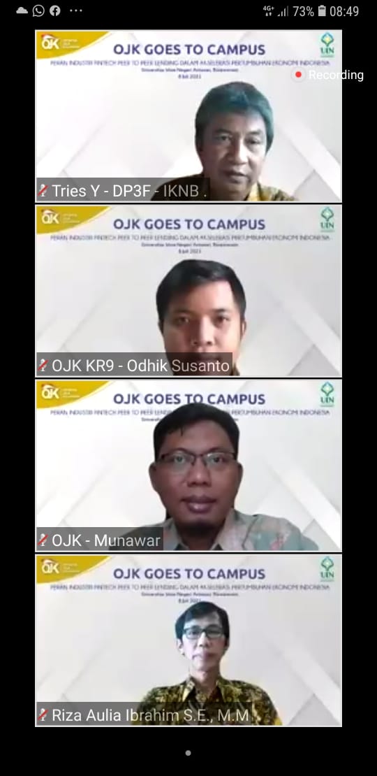 Banjarmasin, BARITO – Otoritas Jasa Keuangan (OJK) mengadakan acara “OJK Goes to Campus 2021” yang diselenggarakan bersama Universitas Islam Negeri (UIN) Antasari, Banjarmasin pada tanggal 8 Juli 2021. Acara yang dikemas dalam bentuk webinar tersebut bertema “Peran Industri Fintech Peer to Peer Lending dalam Akselerasi Pertumbuhan Ekonomi Indonesia.”. Kegiatan tersebut diikuti oleh 284 peserta dari kalangan civitas akademika di UIN Antasari dan perguruan tinggi lain di Kalimantan Selatan. Tujuan kegiatan tersebut adalah untuk memperkenalkan industri fintech peer to peer lending (P2PL) atau fintech lending (pinjaman online) sebagai alternatif pendanaan bagi masyarakat, termasuk memberikan pemahaman pada manfaat dan risikonya.