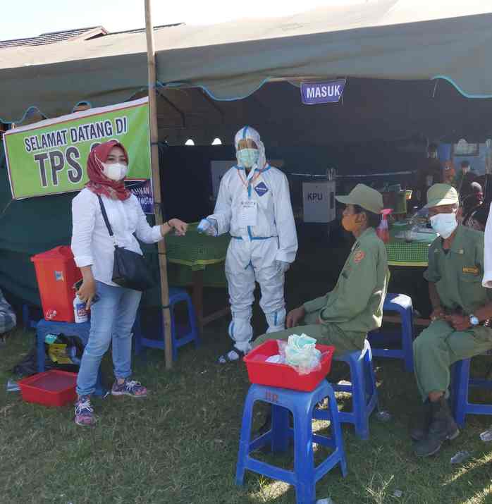 Di depan TPS, sudah tersedia wadah cuci tangan dan sabun cair, tisu kering, masker siap pakai serta petugas yang memeriksa suhu tubuh pemilih.