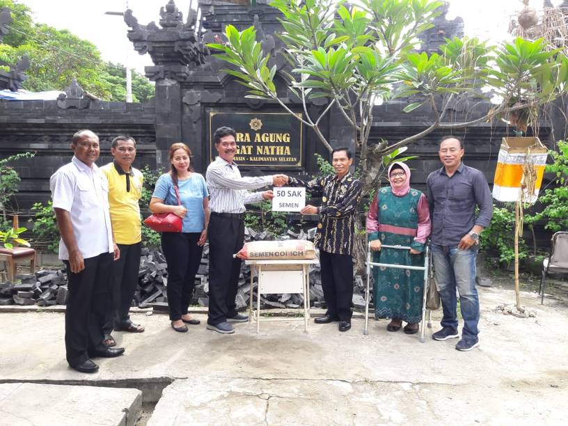 Ketua FKUB Banjarmasin Maskur secara simbolis menyerahkan bantuan sebanyak 50 sak semen kepada panitia Pura Agung Jagatnatha Banjarmasin yang berada di simpang empat lampur merah Jalan Gatot-Veteran tersebut.