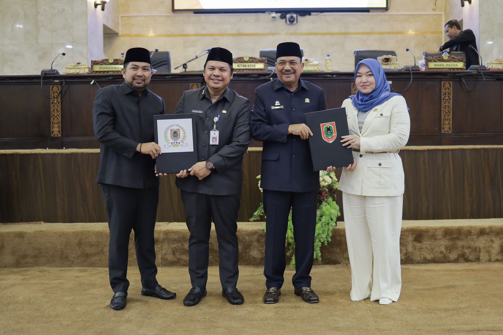Pimpinan DPRD Provinsi Kalsel bersama Sekdaprov Kalsel Roy Rizali Anwar perlihatkan berita acara Raperda RTRW Provinsi Kalsel 2023-2043 disetujui menjadi Perda.(foto : humasdprdkalsel)