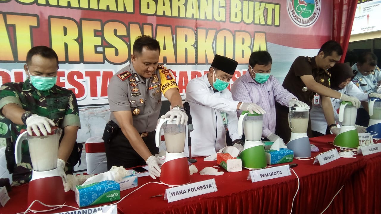 Setelah satu persatu sabu dibuka dan potong kemudian dimasukkan ke dalam enam mesin blender yang dipegang oleh Kasdim 1007 Mayor Maserani, BNNK AKBP Noramawati, Kasi Kejari Harry Fauzan, Balai Besar POM, Hanif dan KTU KPN H Salwan Firdaus SH serta M Muhyar selaku staf ahli Bidang Hukum PemkoBanjarmasin.