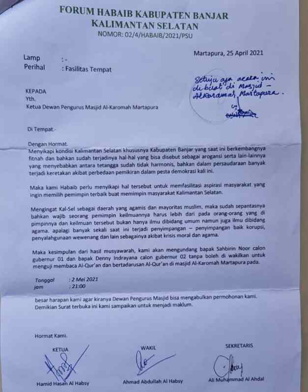 “Dalam rangka kegiatan doa bersama dan tadarusan Al Qur’an tersebut, perihal tempat kami sudah mendapatkan izin dari Ketua Masjid Al Karomah Martapura, sesuai disposisi pada surat permohonan kami tanggal 25 April 2021 kemarin, pada acara tersebut kami juga mengundang pihak Bawaslu, dan surat undangan kami juga sudah diterima oleh pihak Bawaslu sesuai surat undangan kami kepada pihak Bawaslu tanggal 29 April 2021,” tambahnya.