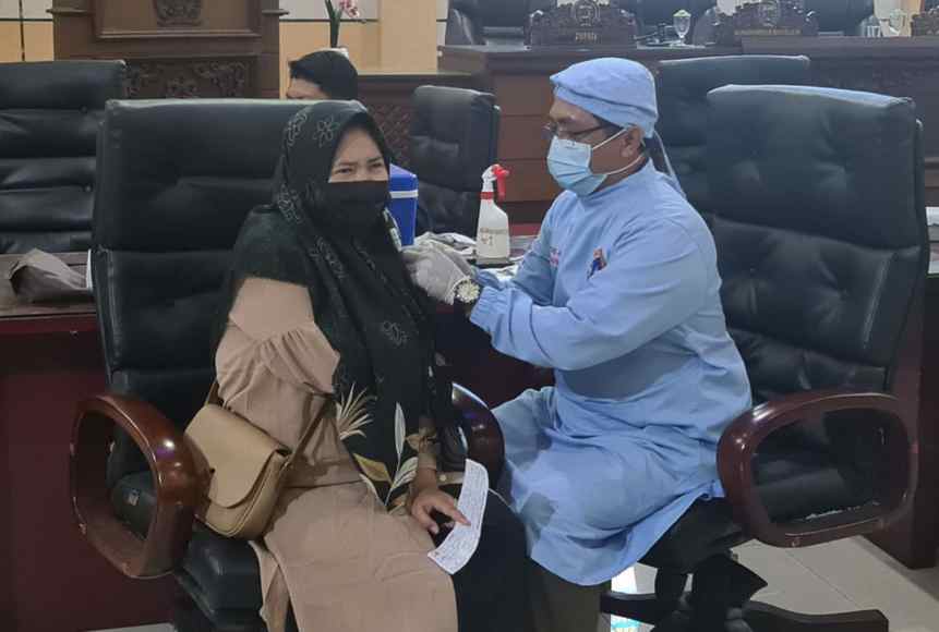 Martapura, BARITO – Serbuan vaksin untuk masyarakat maritim (Pesisir) Kabupaten Banjar, digelar TNI AL-Lanal Banjarmasin bekerjasama dengan Kamar Dagang dan Industri (Kadin) Kabupaten Banjar di kantor DPRD Kabupaten Banjar, Kamis (14/10/2021).