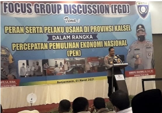 Banjarmasin, BARITO – Polda Kalsel menggelar Focus Group Discussion (FGD) dengan tema “Peran Serta Pelaku Usaha di Propinsi Kalsel Dalam Percepatan Pemulihan Ekonomi Nasional”.