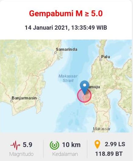 Kotabaru BARITOPOST.CO.ID – Sekitar pukul 13.35 wita, telah terjadi. gempa di daerah Majene Provinsi Sulawesi Barat dengan kedalam 10 kilometer dan getaran tersebut sangat terasa di wilayah kabupaten kotabaru .