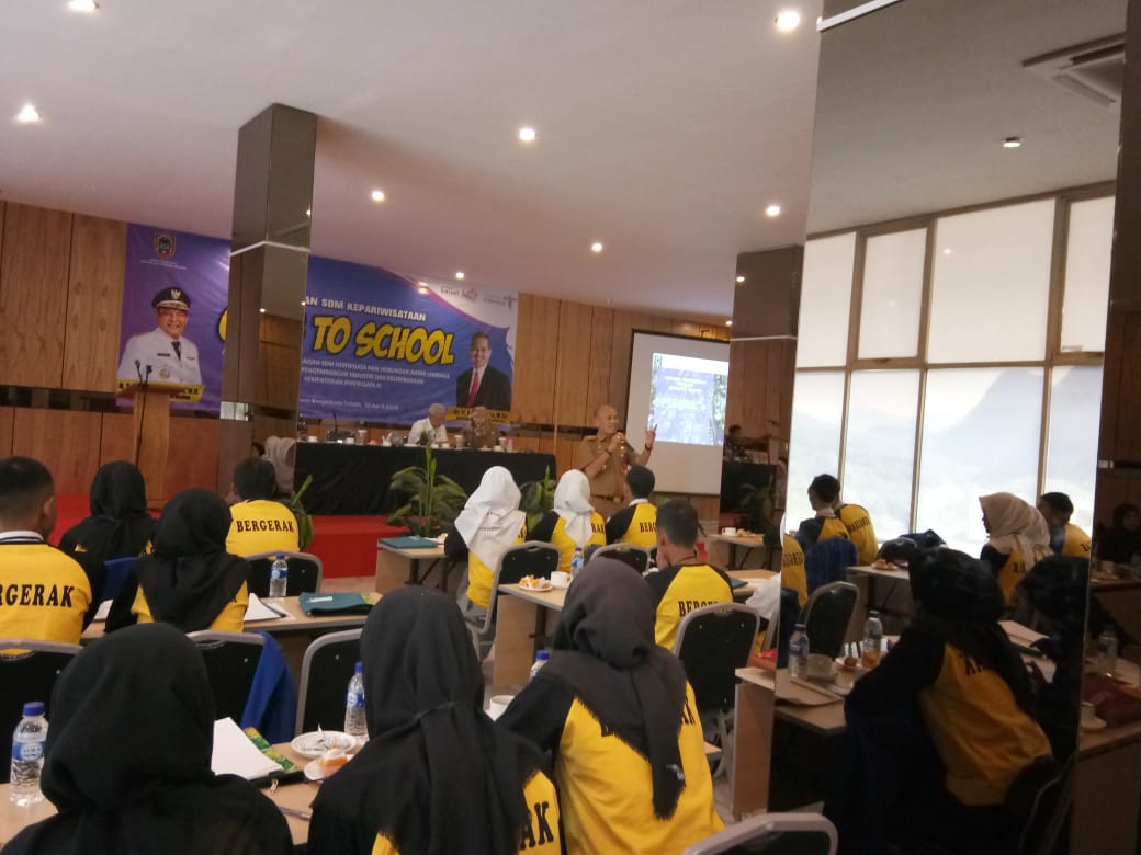” Pada kegiatan ini, siswa diberi pemahaman tentang kepariwisataan. Generasi muda milenial harus mengetahui Sapta Pesona. Melalui mereka, kita bisa mengembangkan Sapta Pesona, yang didalamnya juga mengandung perilaku cinta lingkungan,” ujarnya.