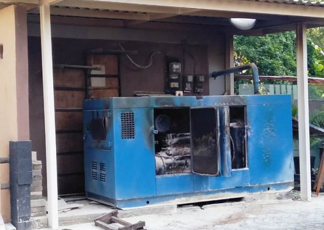 Pagi itu, mesin genset yang baru dihidupkan oleh seorang karyawan setempat, tiba-tiba terbakar. Akibatnya asap hitam membumbung tinggi dan terlihat dari kejauhan. Dua unit mobil Pemadam Kebakaran (PMK) berdatangan ke lokasi guna mengeroyok mesin tersebut.