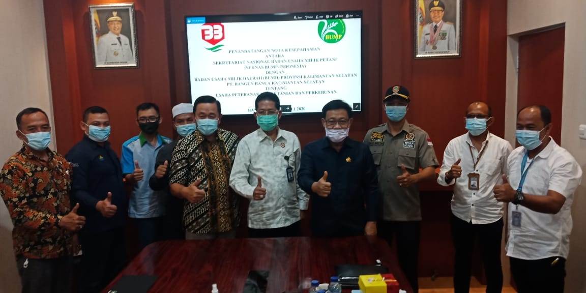 Banjarmasin, BARITO – Memorandum of Understanding (MoU) atau perjanjian kerjasama antara Sekretariat Nasional Badan Usaha Milik Petani Indonesia (Seknas BUM Petani Indonesia) dengan Perusahaan Daerah PT Bangun Banua tentang Usaha Peternakan, Pertanian, Perkebunan disaksikan Ketua Komisi II DPRD Provinsi Kalsel Imam Suprastowo dan Sekretarisnya Muhammad Yani Helmi serta Direktur PT Jamkrida Kalsel Suyanto dan Perwakilan Bank Kalsel, di aula Bangun Banua, Rabu (1/7/2020).