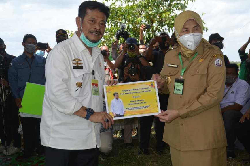 Penghargaan atas apreasiasi pengamanan pangan saat masa pandemi Covid-19 diserahkan menteri kader Golkar tersebut, disela melakukan acara panen raya di Handil Mesjid, Desa Anjir Pasar Lama, Kecamatan Anjir Pasar, Kabupaten Barito Kuala (Batola), Senin (31/8).