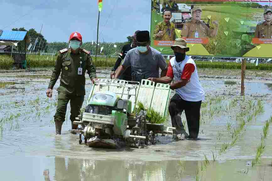 Usai panen perdana, Gubernur Kalsel juga menandai penanaman padi unggul seluas 100 hektar dengan mengoperasikan mesin tanam padi.