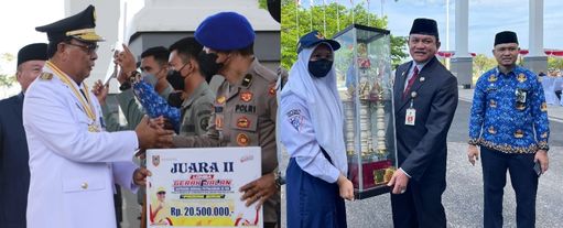 Banjarbaru, BARITO – Gubernur Kalsel H Sahbirin Noor dan Wakil Gubernur Kalsel Muhidin menyerahkan penghargaan kepada pemenang gerak jalan HUT ke-77 RI dan Hari Jadi (Harjad) ke-72 Provinsi Kalsel, Rabu (17/8/2022) pagi di Halaman Kantor Setda Kalsel, Banjarbaru.