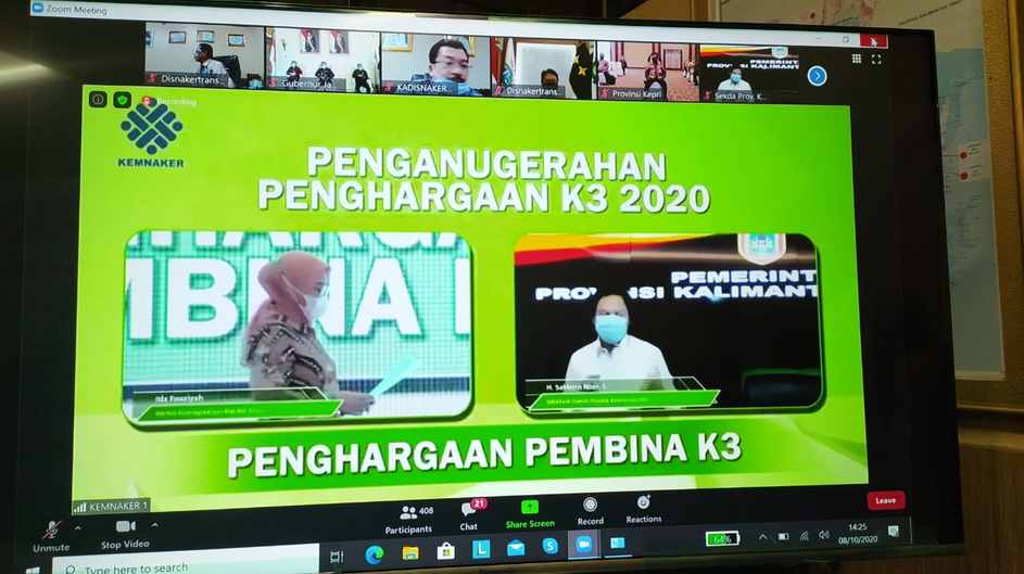 Plh Sekdaprov Kalsel, Roy Rizali Anwar mewakili Plt Gubernur Kalsel, Rudy Resnawan menerima penghargaan sebagai Pembina K3 Terbaik Tingkat Nasional Tahun 2020 yang dilakukan secara daring, Kamis (8/10) di Ruang Serba Guna Kemnaker RI, Jalan Gatot Subroto di Jakarta.