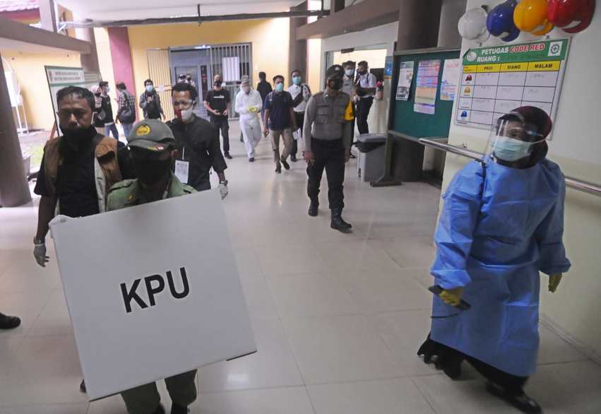 Tampak para petugas kelompok penyelenggara pemungutan suara (KPPS) bersama panwas dan aparat keamanan lainnya berupaya jemput bola mendatangi pasien di RSUD Ulin, Rabu (9/12/2020)