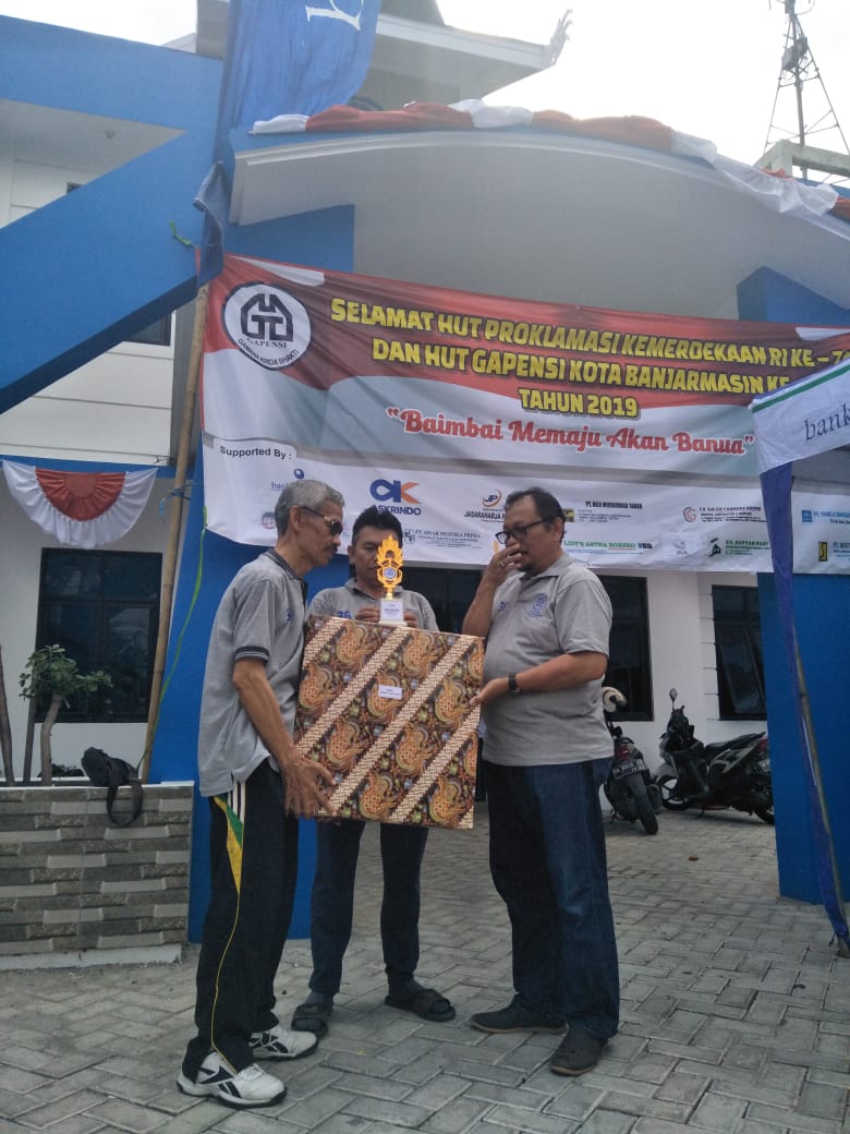 “Kemenangan ini menjadi kenangan tersendiri disaat memperingati HUT Gapensi Kota Banjarmasin,” ungkap H Tajuddin Noor usai menerima piala dan bingkisan hadiah yang diserahkan langsung Ketua Dewan Pertimbangan BPC Gapensi Kota Banjarmasin, H Akhmad Zainuddin.
