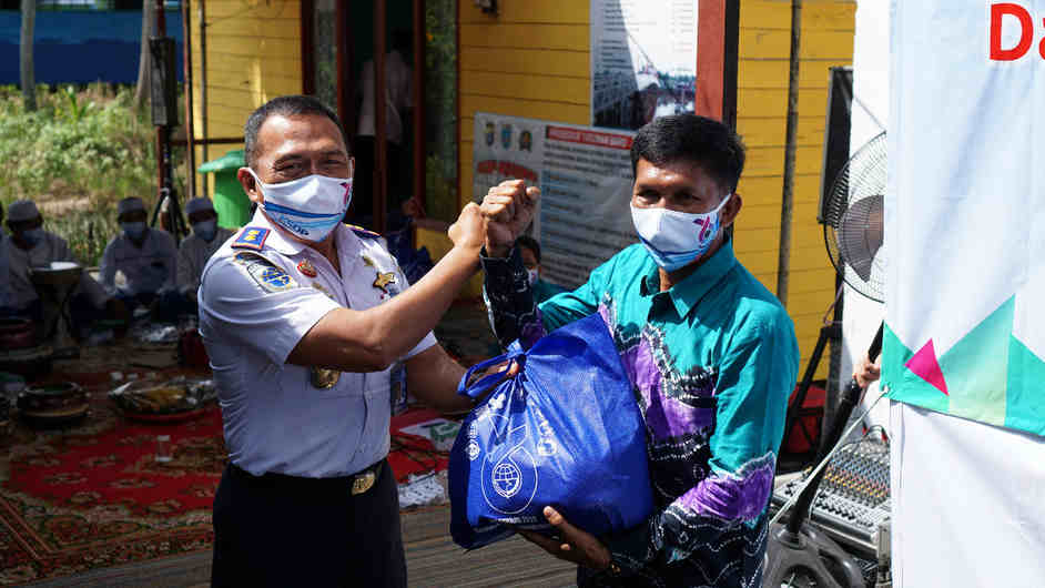 Sedang KSOP Kelas I Banjarmasin menyerahkan sejumlah paket sembako dan masker, kepada Warga sekitar.