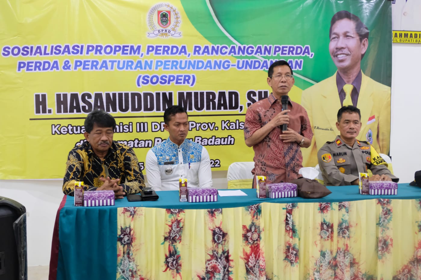 Rantau Badauh, BARITOPOST.CO.ID – Ketua Komisi III DPRD Provinsi Kalimantan Selatan (Kalsel), H Hasanuddin Murad, SH melaksanakan kegiatan Sosialisasi Peraturan Daerah (Perda) Nomor 4 Tahun 2016 tentang Pemberdayaan Masyarakat Desa (PMD) di Kecamatan Rantau Badauh, Kabupaten Barito Kuala (Batola), Jumat (4/11/2022) sore.
