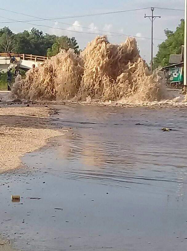 Banjarmasin, BARITO – Pipa ledeng di Sungai Tabuk, Kabupaten Banjar milik PDAM Bandarmasih jebol hingga menyebabkan sembulan air setinggi rumah, Jumat sore (15/2).