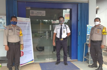 Personel Polsek Karang Bintang Polda Kalsel Bripka Syamsir Rizal bersama Bripka Mujianto sambangi Bank BRI dan bertemu dengan satpam Bank BRI Unit Karang Bintang beri himbauan pesan kamtibmas antisipasi kejadian Curanmor, Senin (05/10/2020).